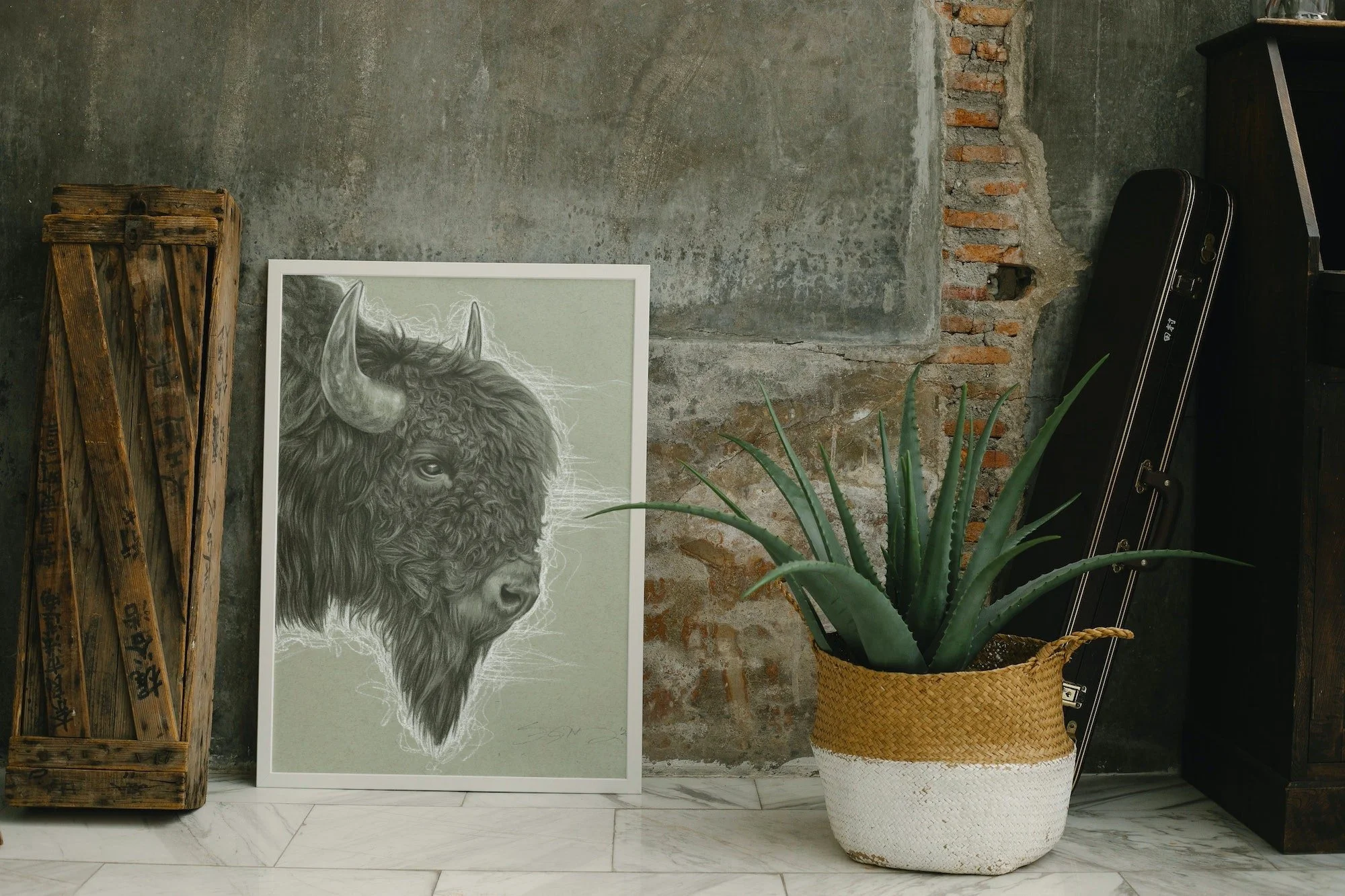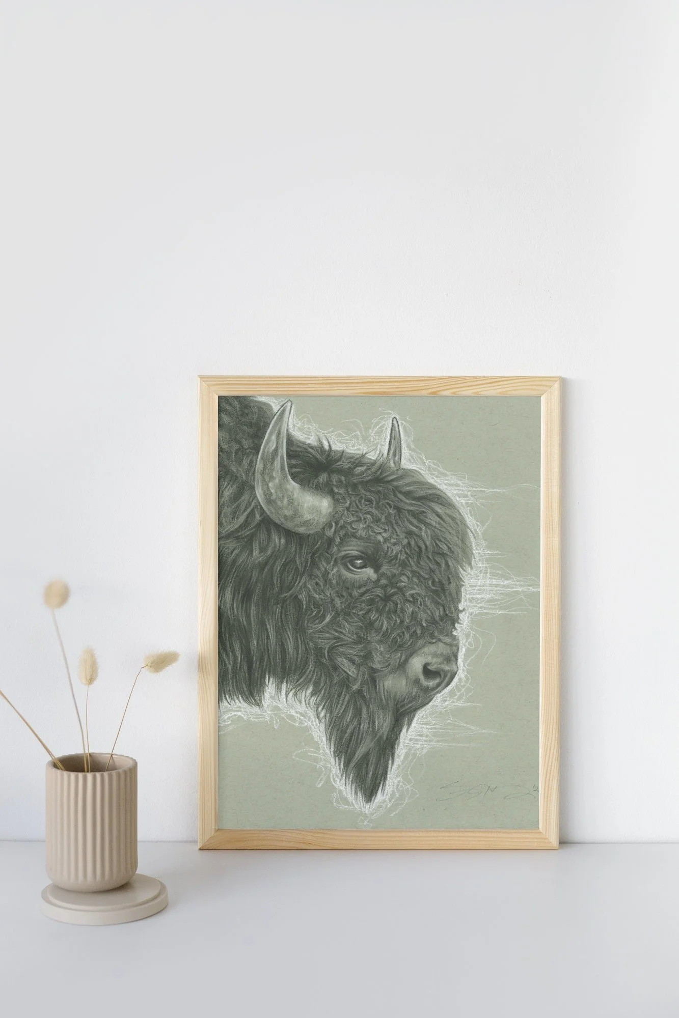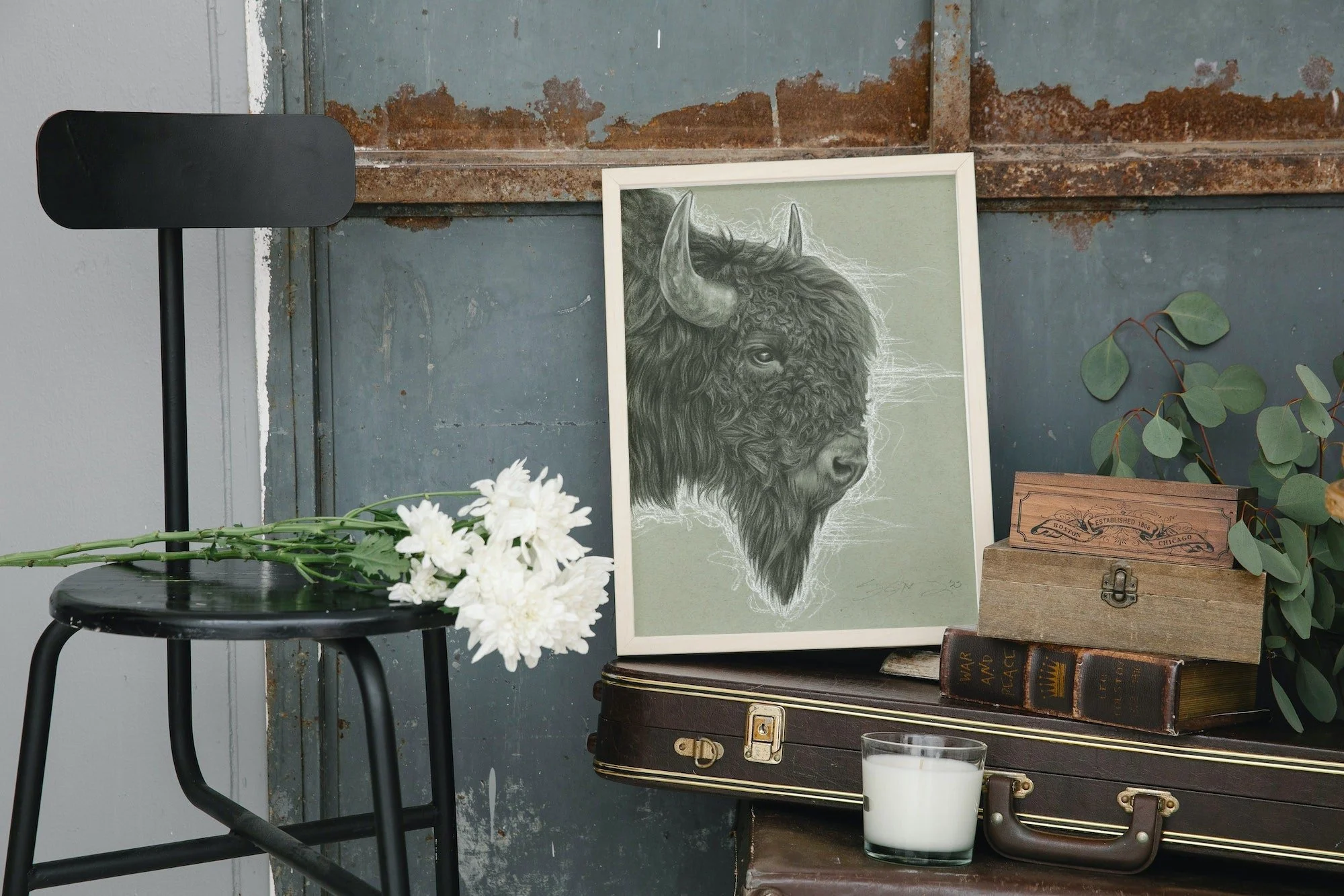 High quality, signed and numbered print of charcoal drawing "Legend of the West", featuring the great American bison by artist Sonja Heisinger. Ships in sturdy cardboard and includes personalized note from the aritst.