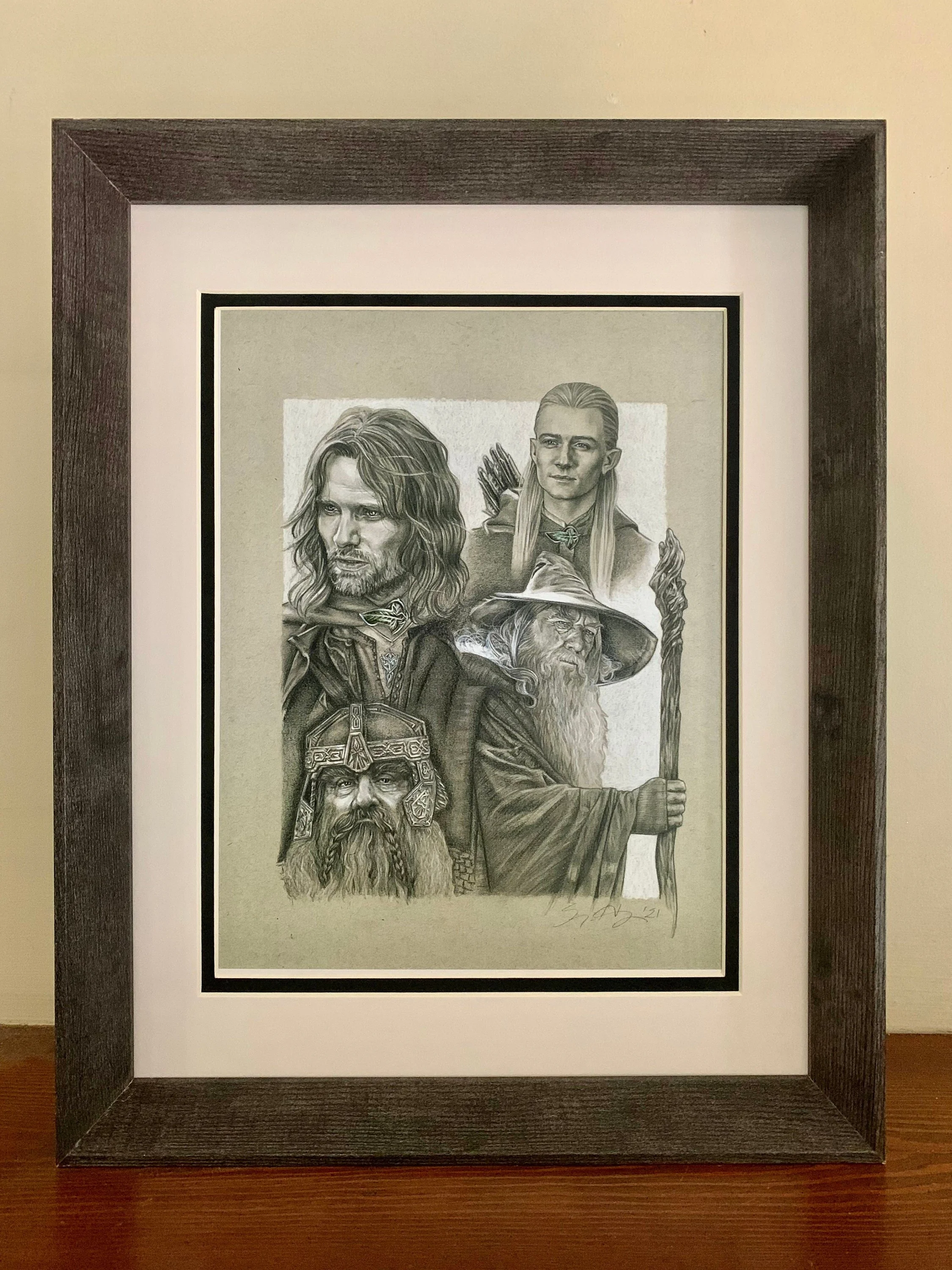 High quality, signed and numbered print of artist Sonja Heisinger's original drawing "The Hunters and the Wizard" featuring characters from The Lord of the Rings Trilogy. Frame not included. Print is wrapped in protective plastic sleeve and ships in a sturdy cardboard envelope. Includes personal note from the artist.