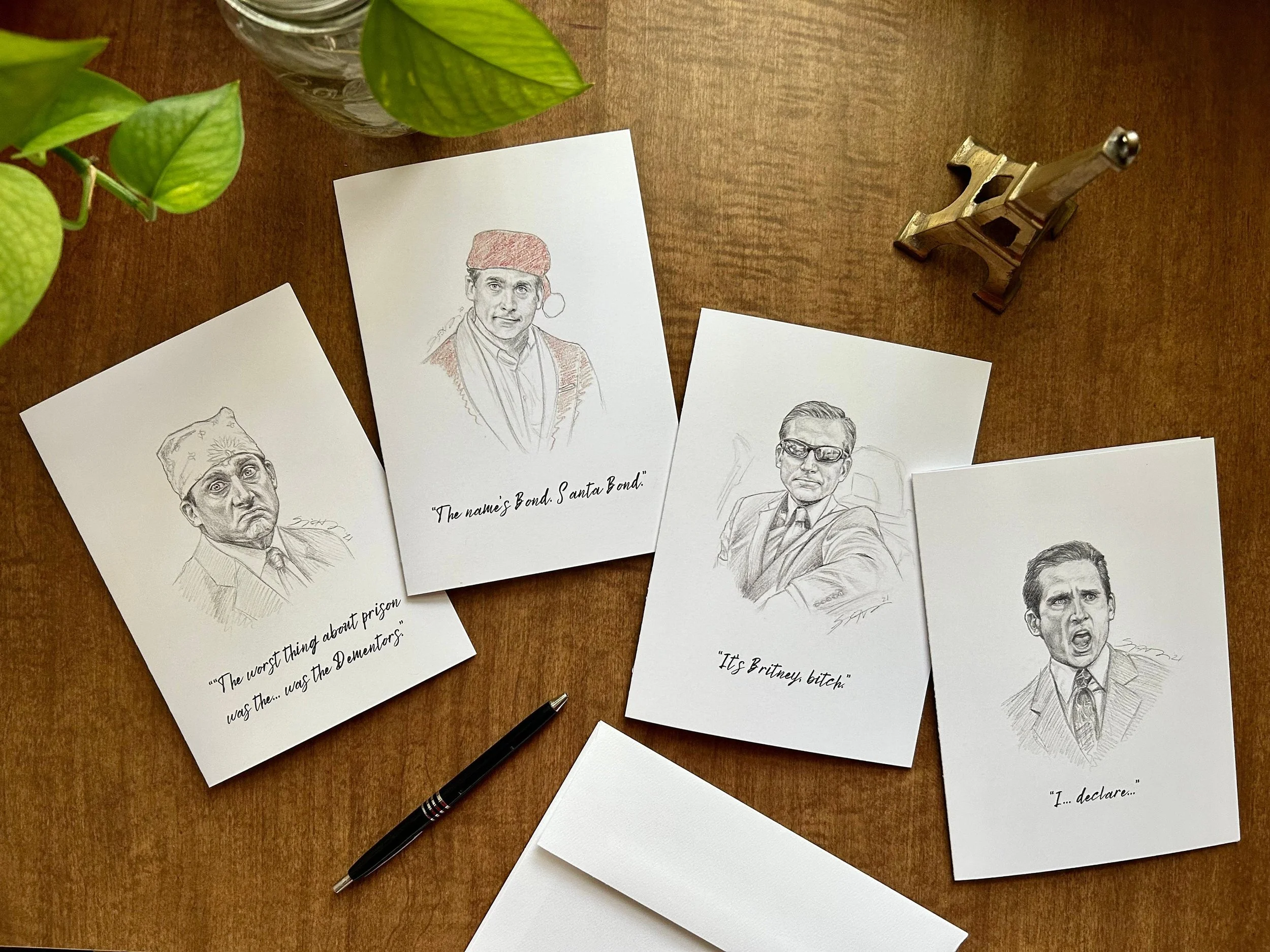 “Scott’s Thoughts” 5x7 greeting cards will be sure to bring a smile to the face of any Office fan! Pack of 4 different minimalist designs featuring Michael Scott from The Office, including quotes for multiple occasions such as birthday, Christmas, and thank you. Artwork by artist Sonja Heisinger.